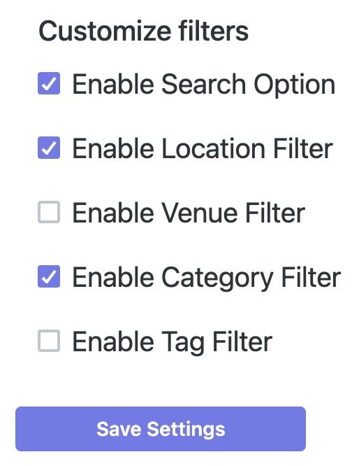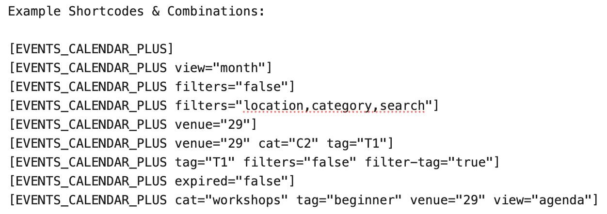 Add shortcode filters to show or hide events by: category, tag, venue, or status, to show only the events you want on that page or in that widget.