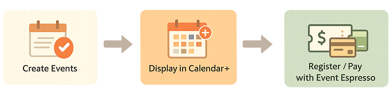 Calendar+ focuses on the calendar experience. If you also need RSVPs, registrations, and payments, the simplest path is pairing it with Event Espresso (free or premium).